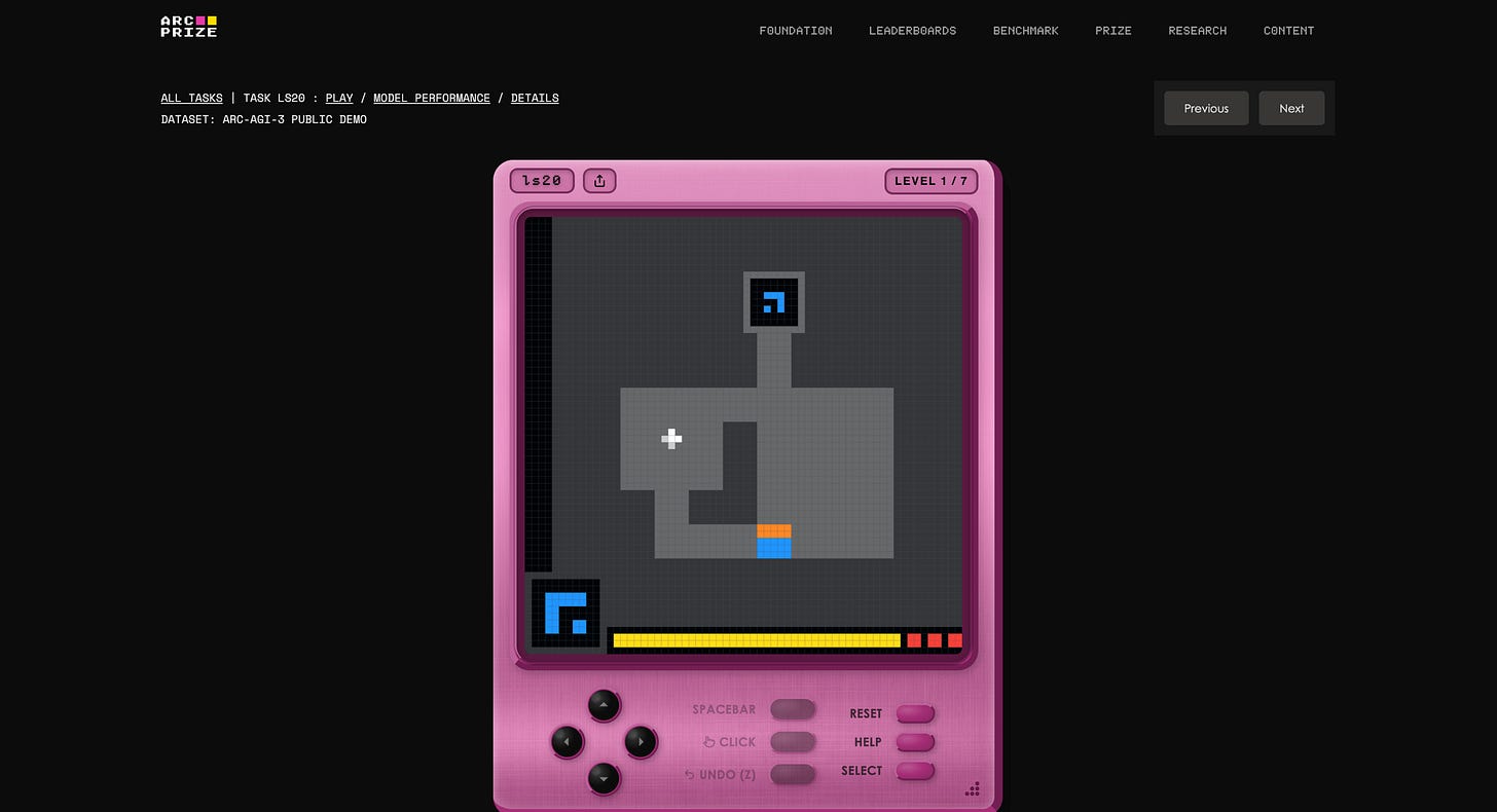 O ARC Prize disponibilizou versões jogáveis do benchmark diretamente em navegadores. Acesse uma das tarefas aqui e veja quanto tempo você leva para descobrir o objetivo e concluir o ambiente. A maioria das pessoas consegue em alguns minutos. Nesse joguinho específico do link, o desempenho de ChatGPT 5.4, Gemini 3.1, Grok 4.20 e Claude Opus 4.6 foi 0%. Se você tiver mais curiosidade, role a tela para baixo e veja o replay do humano de referência (e fique agoniado porque acho que não foi a mais esperta das pessoas...).